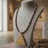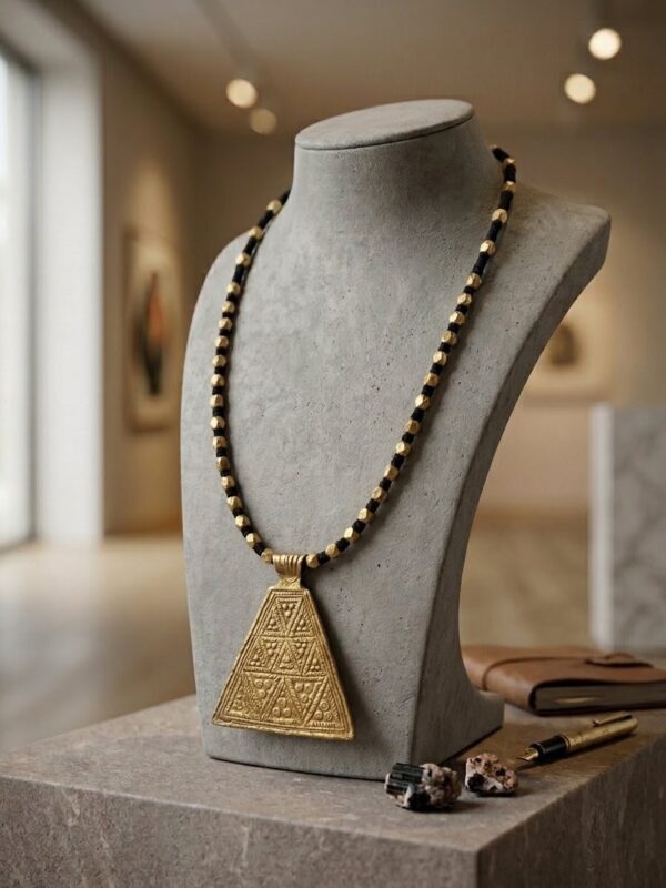A statement-making longline necklace featuring a large, textured geometric pendant. This piece combines the warmth of antique gold tones with the contemporary feel of a beaded cord.
