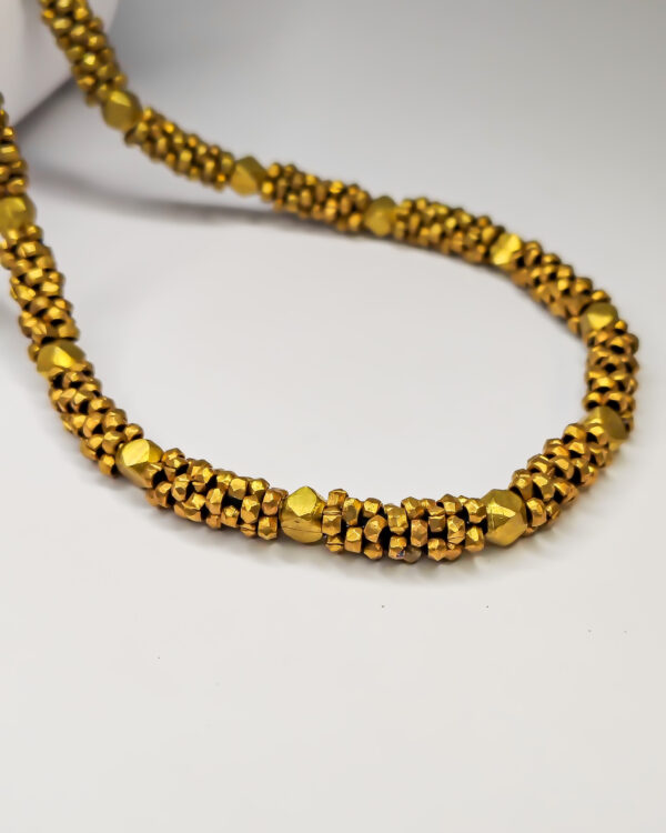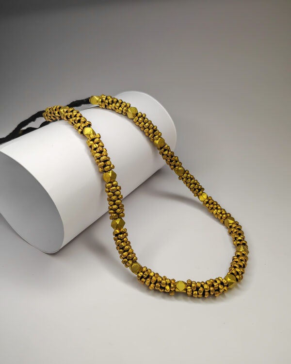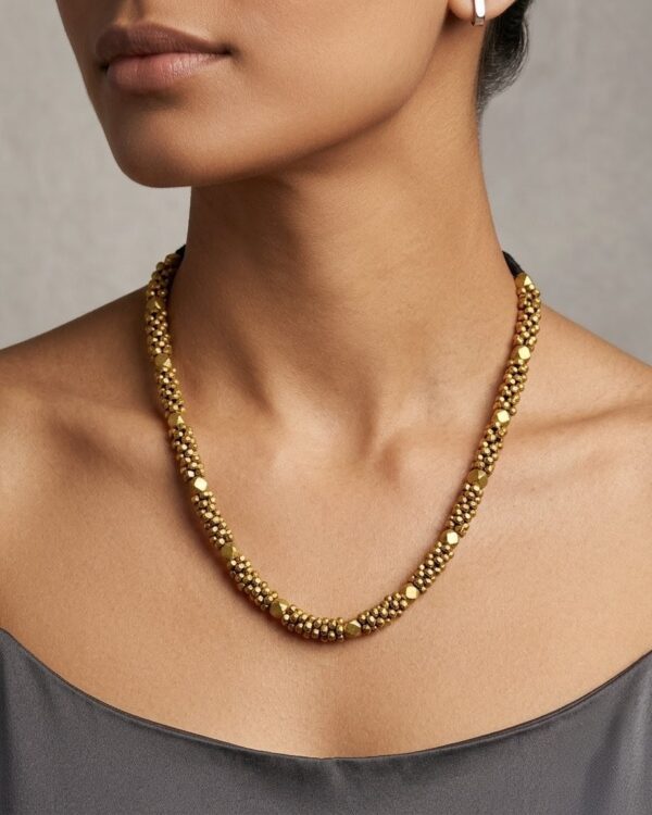 The Aura Faceted Gold Bead Necklace is a masterclass in texture and shine. Defined by its unique, multi-dimensional geometric beads, this necklace creates a bold focal point for any outfit. The warm, radiant gold finish provides a luxurious glow, while the heavy-beaded design ensures it sits perfectly against the collarbone.