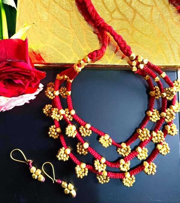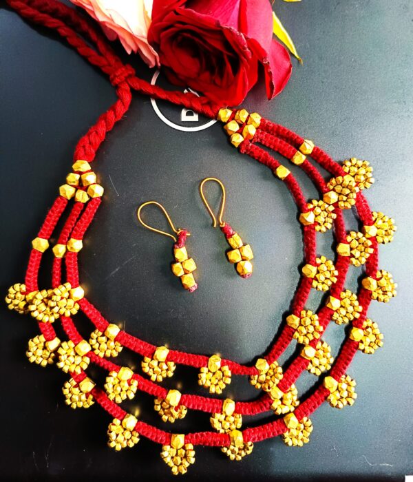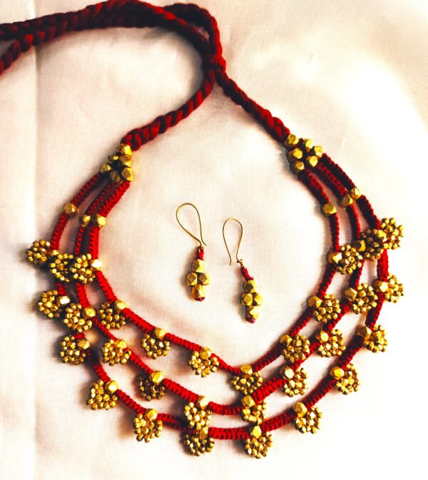 traditional brass beaded dokra necklace features a beautiful sunflower petalmotif, hand crafted by skilled artisans using the ancient technique.there is a beauty in simplicity .the world is yours to explore: go conquer it.