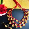 Elegant, three layered, brass sunflower petal motifs, partywear, with earrings, maroon colour