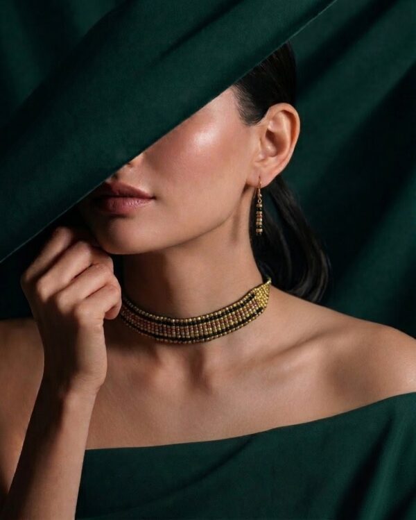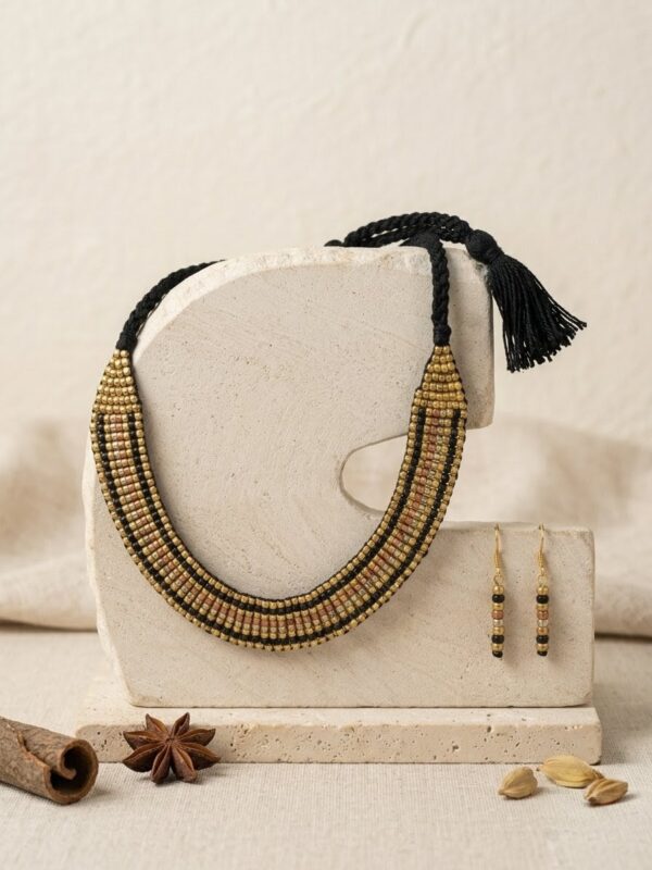 Crafted by skilled artisans using time-honored Dhokra techniques, this jewellery set blends heritage craftsmanship with contemporary fashion. The earthy tones of gold, black, and muted hues make it versatile for festive wear, cultural events, and modern Indo-western styling.