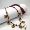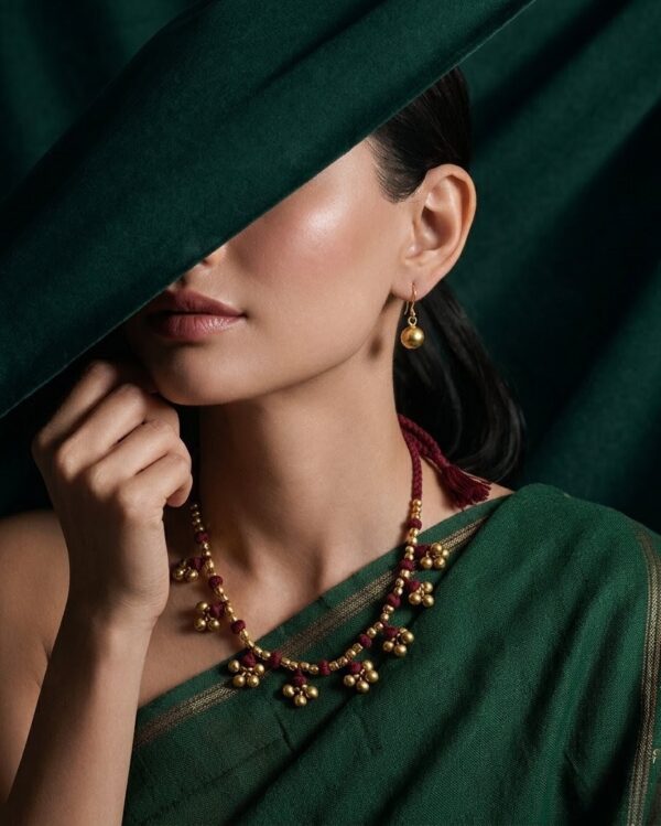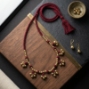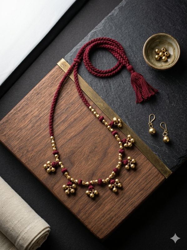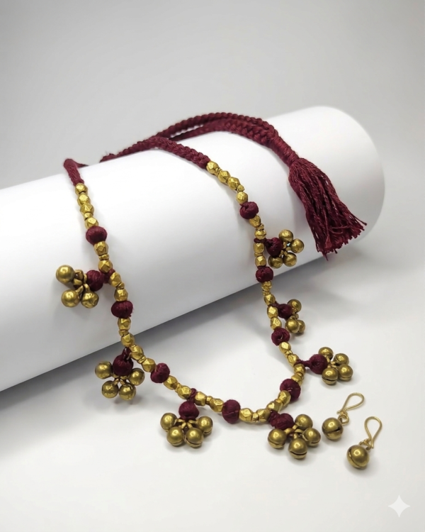 Enhance your look with this traditional handmade maroon thread necklace set featuring golden beads and ghungroo-style charms. Designed for women who love ethnic and handcrafted jewellery, this piece is perfect for festivals, weddings, and cultural events.