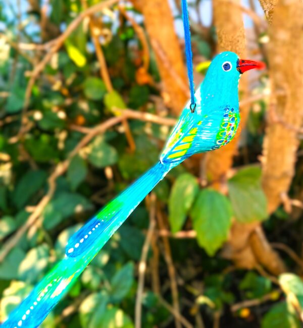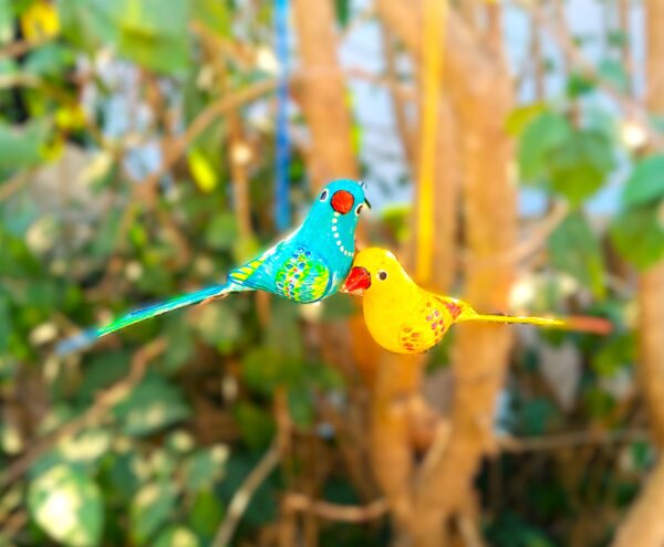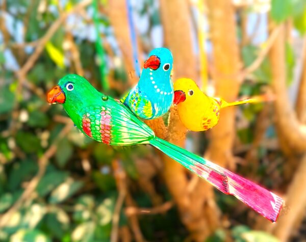 - Hand Crafted- Exquisitely handpainted paper-mache bird ornament in the form of vibrant yellow, green, and blue birds.